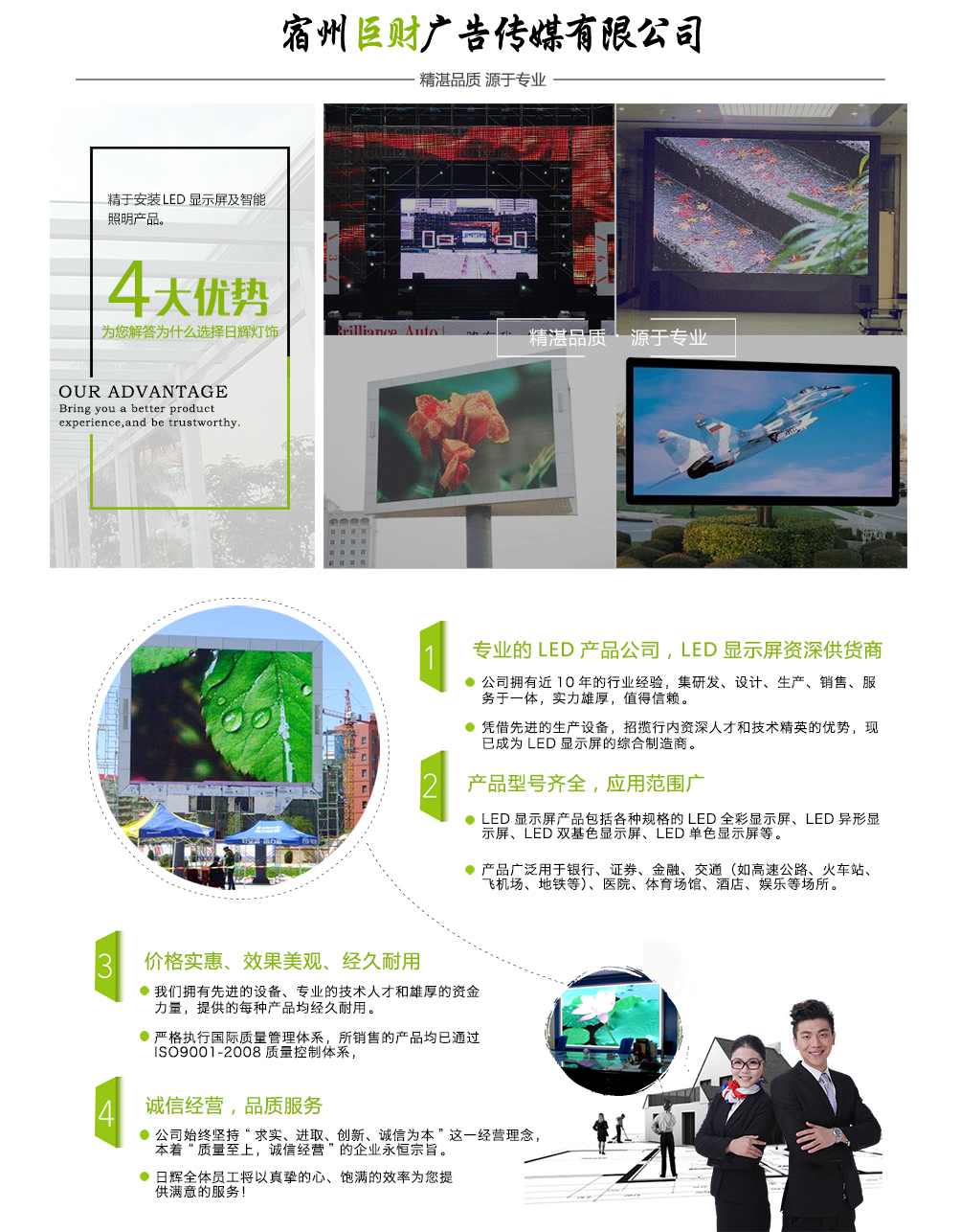 宿州巨財廣告傳媒坐落于安徽省宿州市宿蒙路,是一家設計、制作、安裝、售后為一體的高新科技技術企業。巨財廣告傳媒匯集了大批高素質人才,擁有現代化的專業生產設備與檢測設備,實行了全自動化生產,高度保障了公司核心產品—LED顯示屏的性能,可及時滿足客戶的需求。 宿州巨財廣告傳媒主要致力于向客戶提供高質量LED全彩顯示屏,公司在發展壯大過程中,已經完成各...